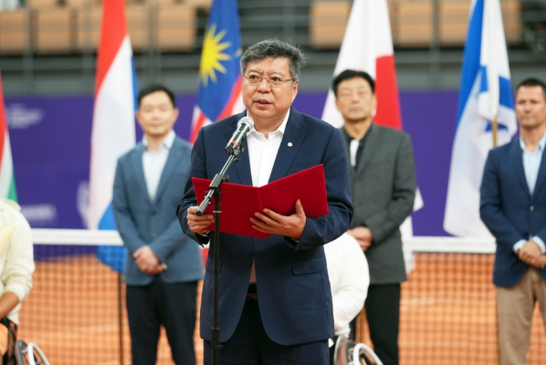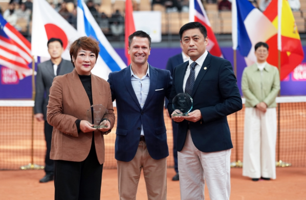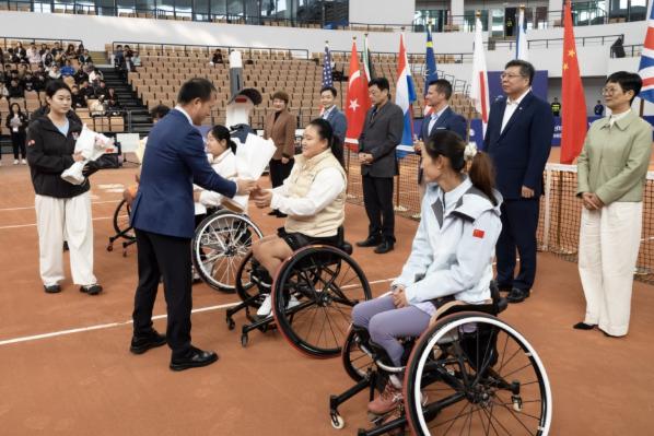 国际网联轮椅网球赛事委员会主席霍尔迪·塔马约随后发表致辞,他对湖州出色的筹备工作表示感谢,并强调了此次大师赛在亚洲首次举办的历史意义。致辞后,塔马约主席向为赛事成功举办做出卓越贡献的中建华夏(北京)产业运营管理有限公司执行董事、总经理刘云晖以及赛事总监云川颁发了荣誉奖杯。