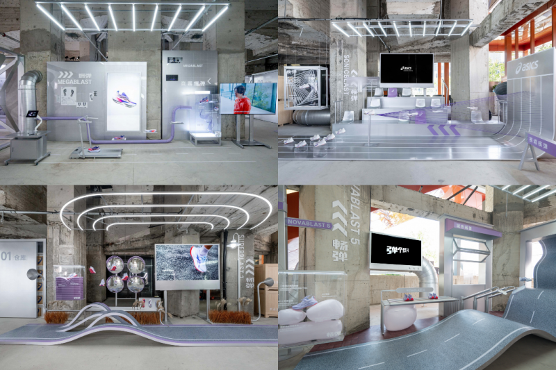 首次亮相的MEGABLAST、SONICBLAST携手NOVABLAST 5 和 SUPERBLAST 2共同组成起全新ASICS亚瑟士回弹家族,覆盖从日常训练到专业竞速的多样跑步场景。为充分展现回弹科技,限时体验空间以“科技工厂”为主题,以灰色金属感配色为主线,点缀紫色与亮光元素,四款产品分区环绕中心装置,消费者可在多元场景中,沉浸式感受不同鞋款的特性优势。
